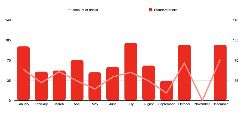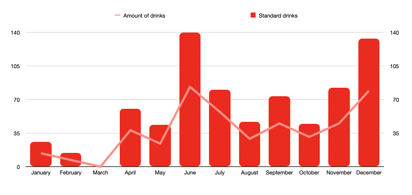 Important note: a standard drink is a standard unit of 10 grams of alcohol. For reference: a pint of 5% beer would contains 19,7 grams of alcohol and thus accounts for 1,97 standard drinks. More info can be found in my 2023 drinking habit analysis.