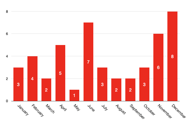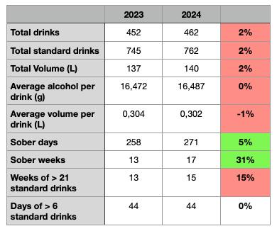 Even though I had higher extremes in 2023 (June and December), my overall monthly alcohol consumption seems to have been lower during that year. Especially during the first quarter of the year. To me it shows how important self-imposed restrictions are regarding alcohol. It also shows me how a few months of minimal drinking can impact the annual stats. In 2025 I'm aiming to apply this lesson and drink far less than I've ever done before.