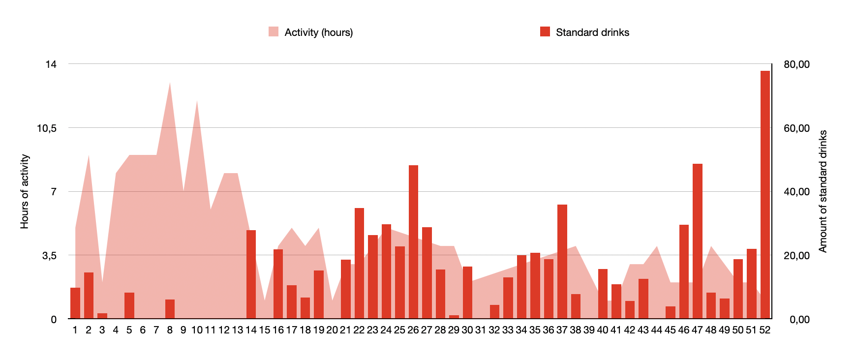 A heavy drinker is defined as someone that drinks minimally once a week more than six drinks. For me this happened 51 days, spread over 26 weeks. Exactly half of the year. I'm having a bit of trouble interpreting this data. 26/52 weeks doesn't sound too bad to me. But 51 days sounds like quite a lot. Well, in any case I think it would be good to decrease my alcohol consumption.