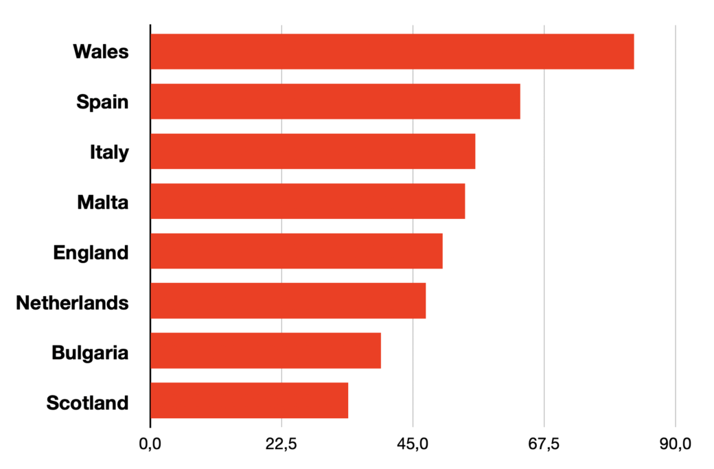 Looking at the data the first thing you'll notice is that Wales is really pulling its weight here. I only spend three days there, but it managed to make its way to the top of almost every list. It's the place where I drank the most drinks per day (14,92 standard units per day on average) And not just that, the drinks I drank there were also the strongest on average! I recall drinking a lot of sloe-gin and red wine!