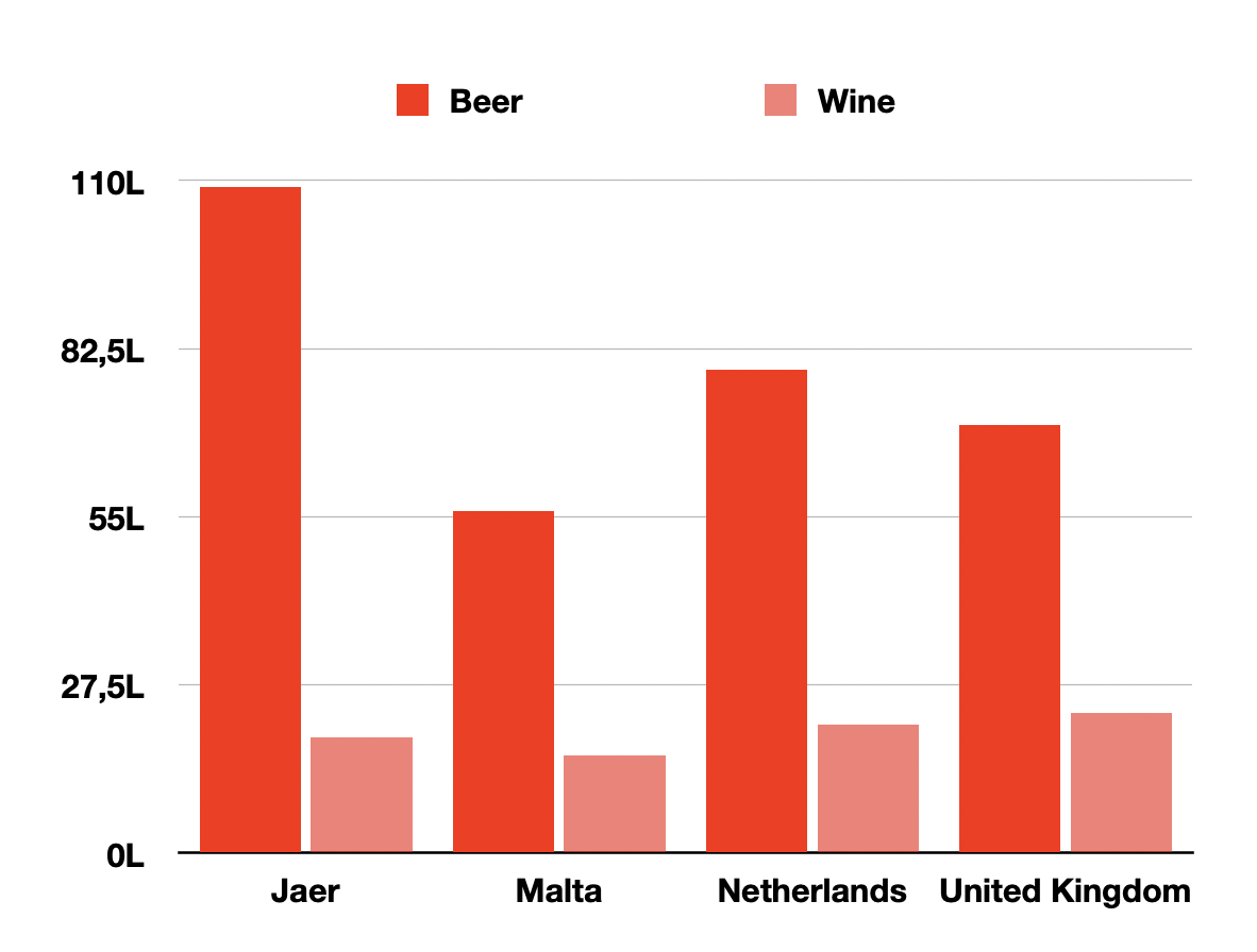 Gulp... I have drank almost double the amount of beer as an average Maltese person... and about 1.5x as much as an average Dutch/UK person. That really surprises me to be honest. I've always seen myself as a fairly moderate drinker. Okay, maybe once or twice a month I will go all out at a party, but apart from that I rarely drink, right? Well... apparently not.