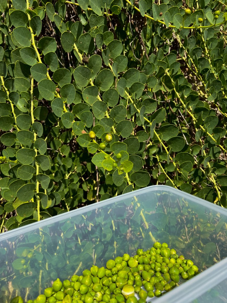 Het interessante aan kappertjes vind ik dat het niet de vruchten of de zaden zijn van de plant die gegeten worden, maar de bloemknopjes (overigens worden wel meer delen van de plant gegeten, maar de kappertjes die we in de supermarkt tegenkomen zijn dus de bloemknopjes). Hieronder heb ik een foto toegevoegd van de bloemknopjes in verschillende staten van ontluiking. De grootste bloemknopjes wil je ontlopen bij het plukken, want die smaken erg melig. De kleinste zijn het beste.