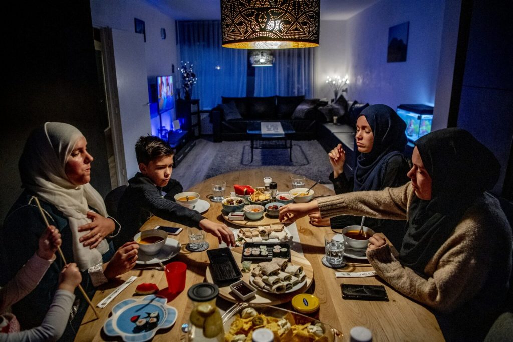 A family gathered together during the iftar, the meal after sunset during the Ramadan - Islamic fasting period. Photo: ANP ROBIN UTRECHT
