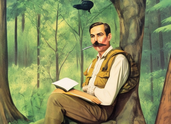 a full colour poster from the 1960 of a explorer with a subtle mustache in a European forest holding a book and a pen