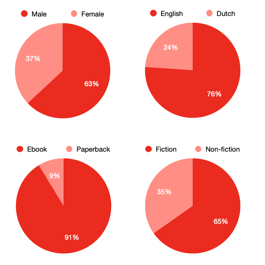 I reached my goal reading 40 books already in November this year, which was a very relaxed experience. I loved that I didn't feel forced to read more books at the end of the year, so that makes me think that 40 books is a good goal to use for each year. Below you can check out some of my reading stats. Most notably is the 37% of female authors that I read this year. If it wasn't for the female-author-reading challenge, this proportion would have been far lower. This provides a solid base for me to continue this challenge into the future.