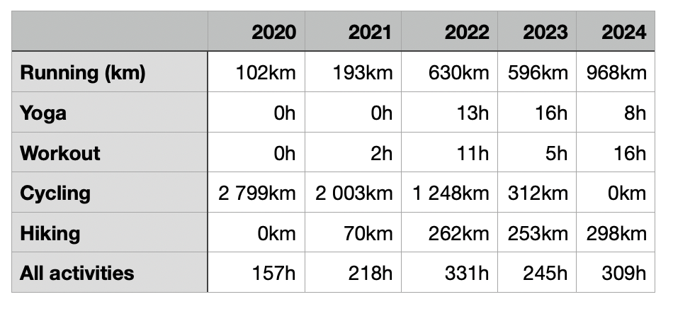 I'm a bit surprised that I did only 8h of yoga in 2024, there might be a error in my data logging there, because I had the idea that I did more yoga than ever. I'll have to look into that. Anyway, I'd like to continue doing a lot of yoga and stretching, as I experience the positive effects of it in a very immediate fashion.