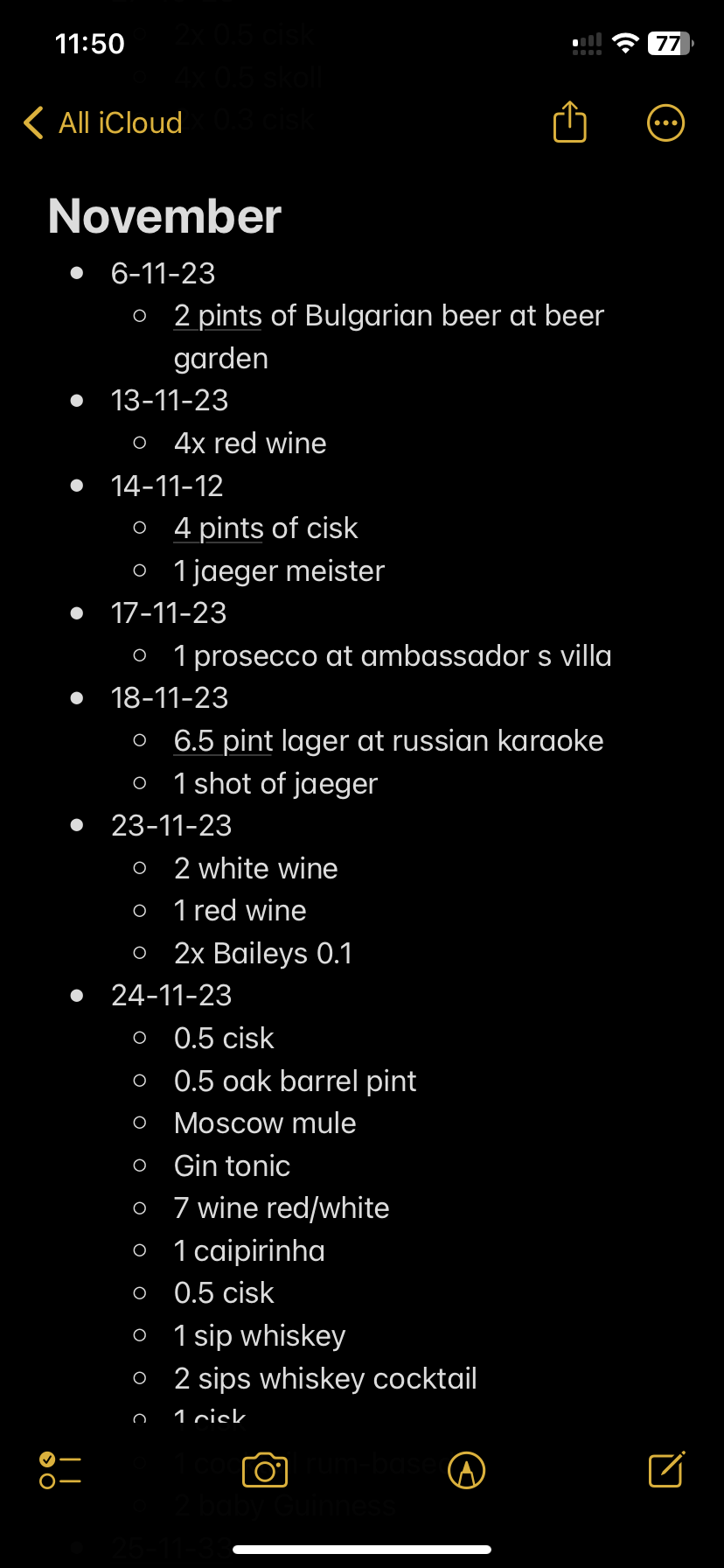 Nothing fancy, just a simple list in my Apple notes app. I honestly think people underestimate the power of Apple Notes. It's extremely quick, light-weight, and reliable. This means that almost I can instantly whip out any of my Apple devices and jot done my alcohol consumption. Very handy.