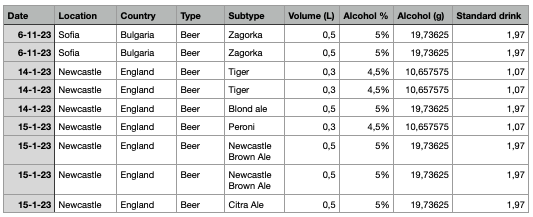 In my notes I recorded: type of drink + volume, but in the spreadsheet I would add additional data such as: location, alcohol percentage, drink subtype.