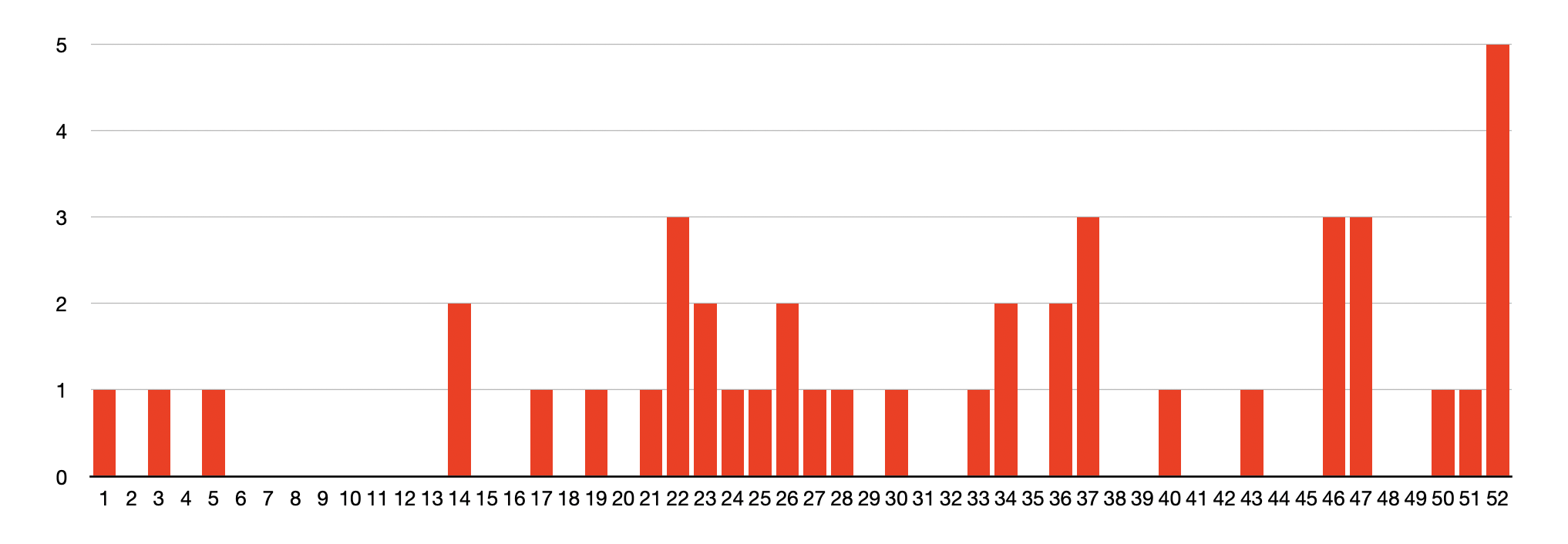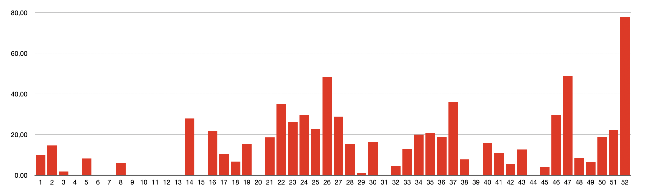 In this graph you can see my consumption per week. In total there were 13 weeks in which I didn't drink a single drop of alcohol. That's about 25% of the year. Not bad I'd say.