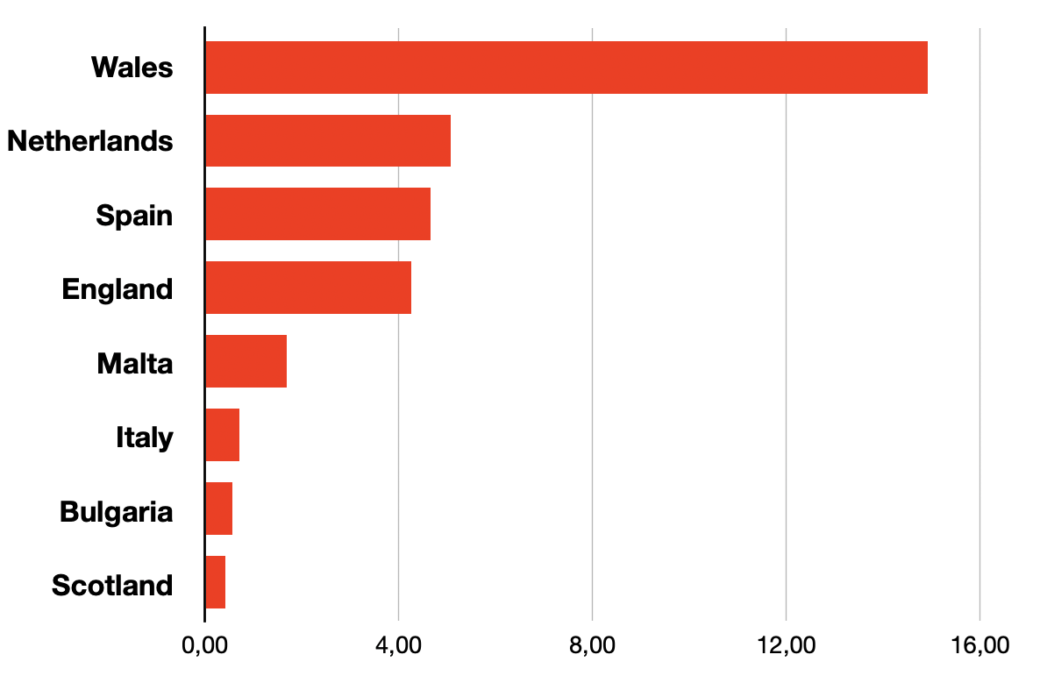 Looking at the data the first thing you'll notice is that Wales is really pulling its weight here. I only spend three days there, but it managed to make its way to the top of almost every list. It's the place where I drank the most drinks per day (14,92 standard units per day on average) And not just that, the drinks I drank there were also the strongest on average! I recall drinking a lot of sloe-gin and red wine!