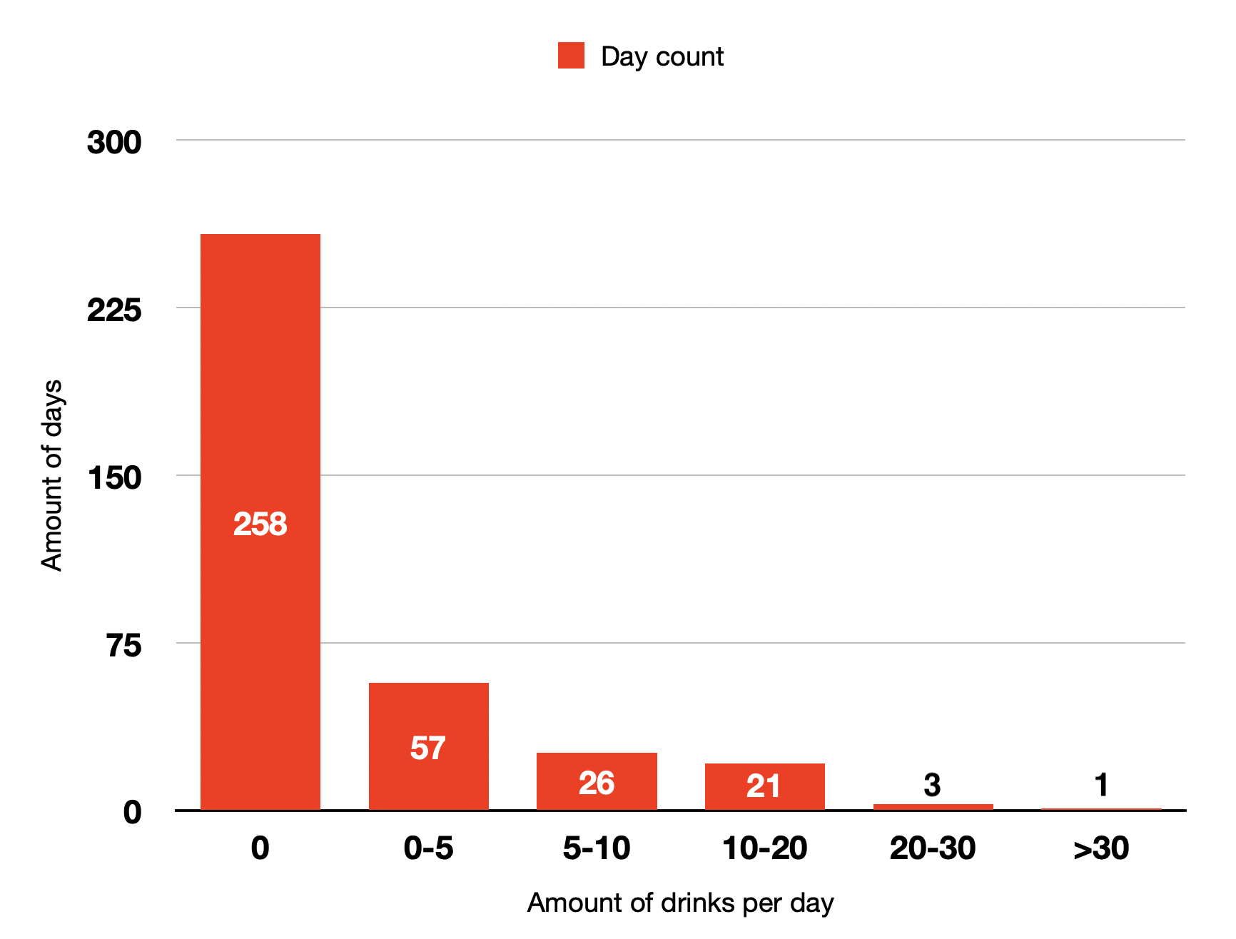 The how-question is answered very easily. I simply kept a tally of every drink I had for 365 days. It's not rocket science. I'll go a bit more in depth in the chapter 'How I tracked my data', but it's very straightforward. The only important thing to note is that I converted each drink to a standard unit drink of 10 grams of alcohol. This will make it easy to compare various numbers later on.