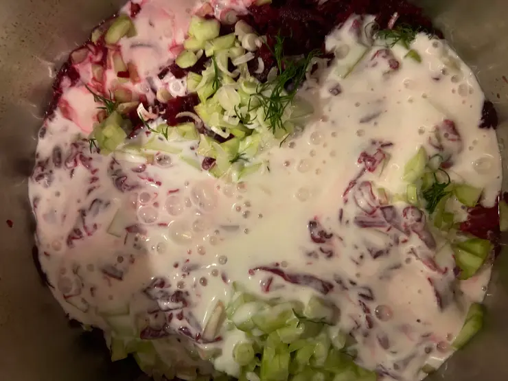 It's literally just chopping up the veggies and then adding the kefir to it. Arnas told me that officially in Lithuania they would use a special type of kefir, dedicated for this soup in particular. To increase the dairy level even more, it's also possible to add some sour cream.