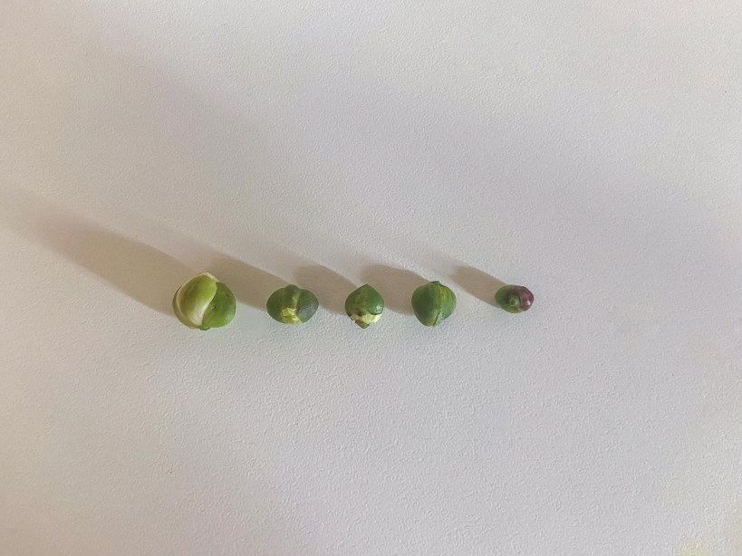 Het interessante aan kappertjes vind ik dat het niet de vruchten of de zaden zijn van de plant die gegeten worden, maar de bloemknopjes (overigens worden wel meer delen van de plant gegeten, maar de kappertjes die we in de supermarkt tegenkomen zijn dus de bloemknopjes). Hieronder heb ik een foto toegevoegd van de bloemknopjes in verschillende staten van ontluiking. De grootste bloemknopjes wil je ontlopen bij het plukken, want die smaken erg melig. De kleinste zijn het beste.