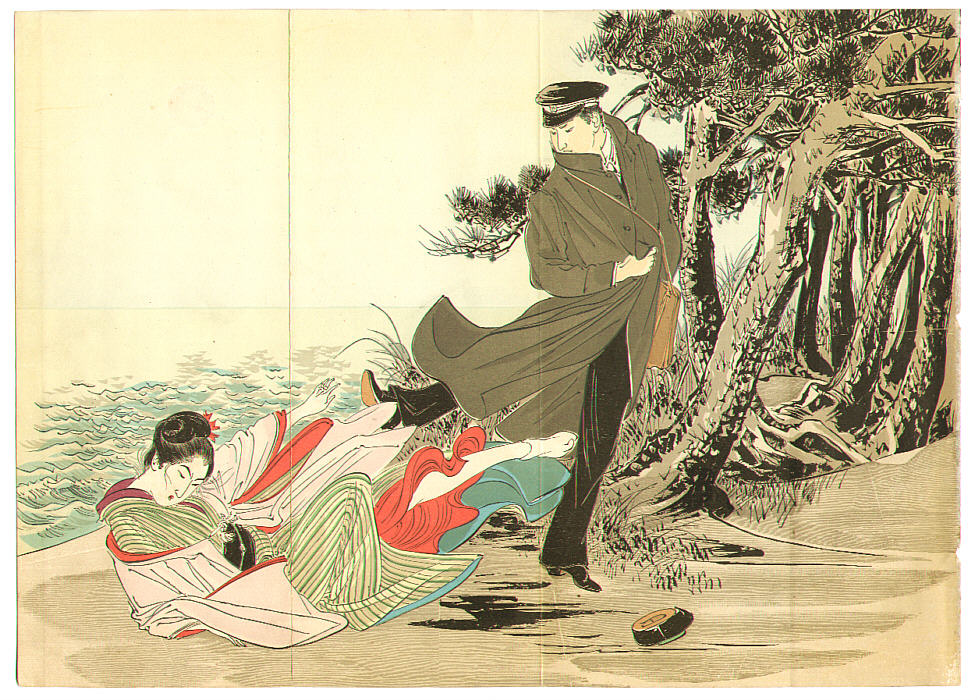 Beeld bij het verhaal Konjiki Yasha (Gouden nacht duivel) waarbij hebberigheid een breuk veroorzaakt tussen twee geliefden. 'Miya en Kan'ichi - Demonisch Goud', (Takeuchi Keishu, 1898) Bron: Artelino - Japanese Prints