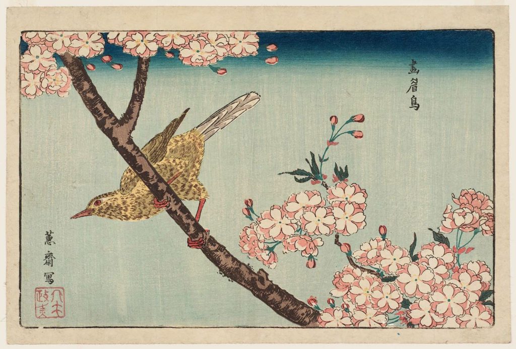 'Gors (Gabichô) en kersenbloesems', (Kitao Masayoshi, 1790) Bron: Museum of Fine Arts. Herdruk van het album Kaihaku raikin zui (Een compendium met afbeeldingen van uit het buitenland _geïmporteerd_e vogels)